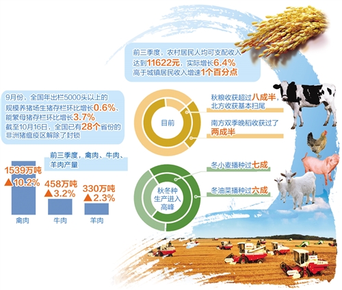 “小康不小康,关键看老乡。”前三季度,农村居民人均可支配收入达到11622元,实际增长6.4%,高于GDP增速0.2个百分点,高于城镇居民收入增速1个百分点;城乡收入比为2.75,较上年同期缩小0.03。产业扶贫成效明显,累计建成各类扶贫产业基地10万个以上,92%的贫困户参与到乡村产业发展,贫困农户收入增速继续高于全国农村居民平均水平。乡村消费保持较快增长,前三季度全国乡村消费品零售额达到43150亿元,同比增长9%,高于城镇1个百分点。