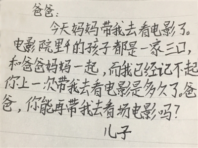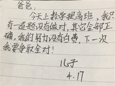 4年前,浩宇开始与父亲写纸条交流。他把自己想说的心里话,高兴的不高兴的,埋怨的关心的,新鲜的有趣的,甚至自己会做不会做的数学题,都写在纸条上,贴在进出的家门前,或者放在客厅的茶几上。张君则会在下班回家或出门前,仔细看儿子的留言,然后认真地回复。
