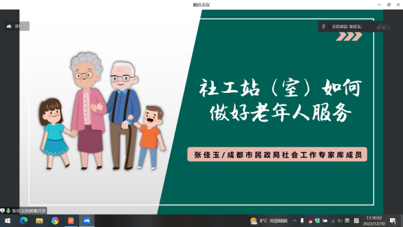 为进一步提升同安街道辖区内社会组织和社工室社工的专业能力,帮助他们学习老年社会工作和儿童小组活动开展的相关知识与技巧,助力辖区“一老一小”服务工作质量的提升。2022年12月30日下午,在龙泉驿区民政局的支持下,由龙泉驿区同安街道办事处主办、成都市龙泉驿区同安街道社工站承办的“学在同安,赋能提升”培训活动,通过线上腾讯会议的形式顺利开展。此次培训由《社工如何做好老年人社会工作》《儿童小组活动带领技巧》2个培训主题组成,分别邀请到成都市朗力社工中心总干事张佳玉和成都市社会工作示范服务项目督导尕玛草为大家授课,共吸引辖区38名社工参加。