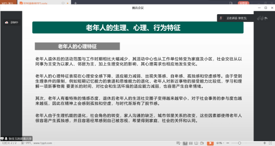 首场培训是由张佳玉老师以《社工如何做好老年人社会工作》为主题进行分享,张老师首先向参会人员介绍了社工站与社工室的职责范围、服务内容,让学员们对服务背景有个全面了解。随后张老师展示了2020年第7次全国人口普查中的老年人普查数据结果,向学员们讲解了老年人的界定与分类,以及各省的老龄化数据,由此阐述了“为什么”,为什么要关注老年人。接着,从生理、心理以及行为特征三个方面的变化分析了老年期的特点及需求,讲解了如何正确使用社会工作理论与工作方法介入老年服务,其中也告诉大家“去了解”,做到真正懂老年人,服务多样化,而非一刀切。接着,张老师从多个角度分析了如何整合资源,以更好的服务老年群体。整个培训,“是什么、为什么、怎么做”条理明晰,有助于提升参会人员对于相关知识的理解。