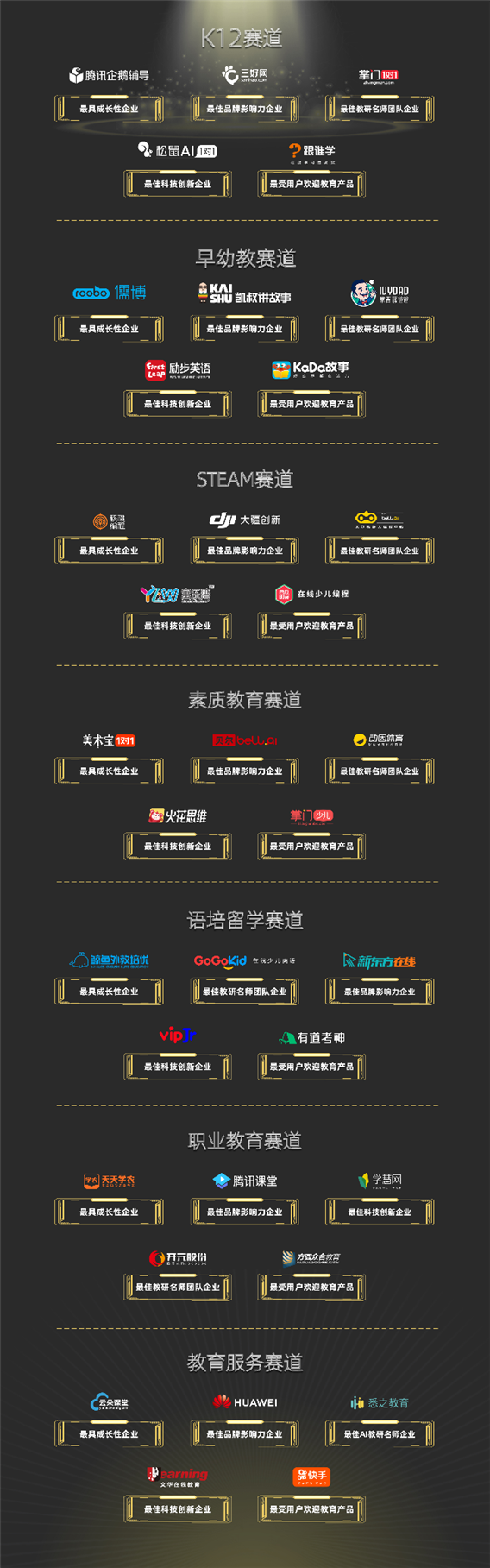 会上,鲸媒体还公布了教育行业年度榜单。据了解,本次寻找中国教育行业的年度“新星”的榜单于9月11日开始正式发起,耗时3个月,通过提名/报名、资格筛选、企业走访、专家复选的方式层层筛选,历时近3个月才产生最终结果,获奖的35家企业覆盖了早幼教、K12、教育服务、语培留学、STEAM 教育、素质教育、职业教育7大赛道,奖项设置也围绕成长性、品牌影响力、教研实力、技术创新突破、用户欢迎度等5个维度来进行,含金量十足。