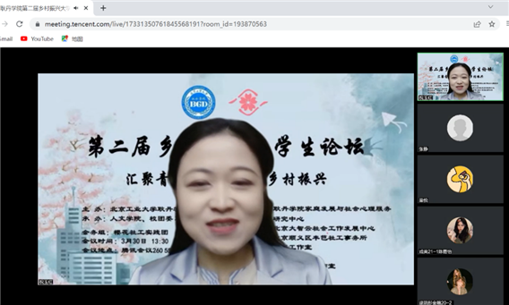 2022年3月30日下午,北京工业大学耿丹学院顺利举办了第二届乡村振兴大学生论坛。本届论坛的主题为“汇集青年力量 助力乡村振兴”,论坛由耿丹学院主办,校团委、人文学院联合承办,耿丹学院家庭发展与社会心理服务中心、北京大智云社会工作发展中心、顺义区丰芑社工事务所、了飘工作室、社区服务工作室、电影与社会工作室、听见工作室等协办。该论坛由耿丹学院社会工作专业学生刘佳欣、何禹辰主持,校内外特邀嘉宾、耿丹人文学院、工学院、国际商学院、国际设计学院师生共1000人参加了本次论坛“云端+线下”的研讨。