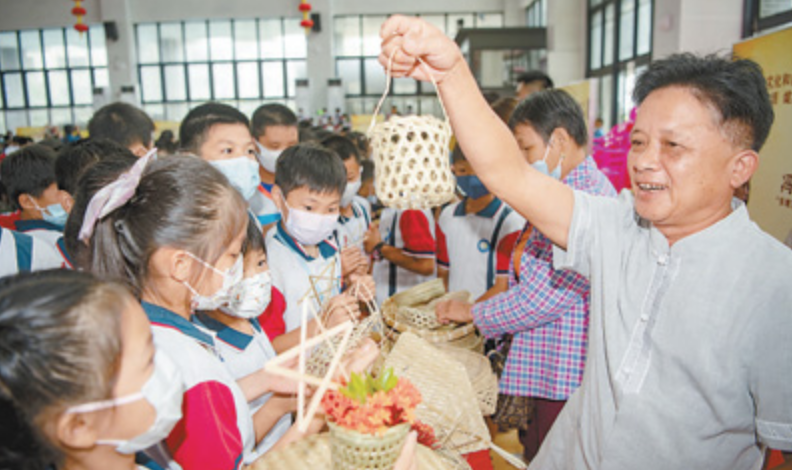 图为海南省琼海市省级非遗传承人冯增超为小学生讲授非遗课程。
