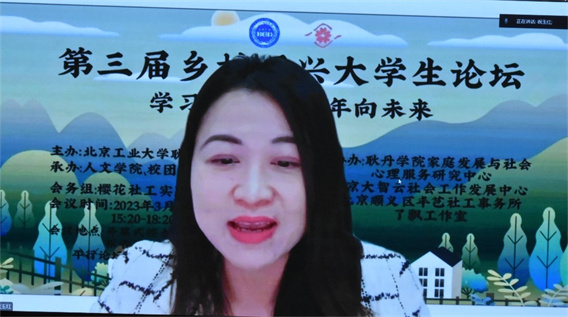 北京市协作者社会工作发展中心主任,首批全国专业社会工作领军人才,首批北京市高级社会工作师李涛老师通过视频为论坛致辞。李老师谈及:这些年来他持续参与了耿丹学院多项活动,每一项活动都让人感受到耿丹学院“学会学习,决心奋斗、追求先进,争取全面”的校训,以及打造一所担负社会使命的百年大学的决心。其中乡村振兴大学生论坛令他印象尤为深刻,从第一届只有社工专业的学生参与到今天有多个专业学生参与,从第一届只有1个论坛到今天4个平行论坛。作为耿丹学院外考官由衷的为大家感到骄傲和自豪。李老师强调:中国是一个农业大国,中国式现代化首先是乡村的现代化,而乡村振兴不是简单的农业振兴而是涉及经济、文化、社会的全面振兴。不仅关系到乡村自身的发展更关系到中国城镇化能否可持续发展,关系到中国式现代化能否成功。实现中国式现代化需要动员各个专业的人才,尤其是青年人才的参与。耿丹学院以实际行动承担起这份责任是让人值得骄傲的事情。本届论坛的论文,每个题目都体现了“耿耿丹心,为国为民”的校魂,蕴含着青春的朝气、青年的力量,大学的智慧和耿丹学院特有的勇气。