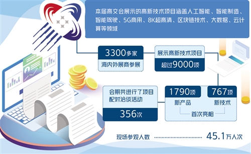 据了解,本届高交会共有3300多家海内外展商参展,展示高新技术项目超过9000项,涵盖了人工智能、智能制造、智能驾驶、5G商用、8K超高清、区块链技术、大数据、云计算等领域。其中,共有1790项新产品和767项新技术首次亮相。