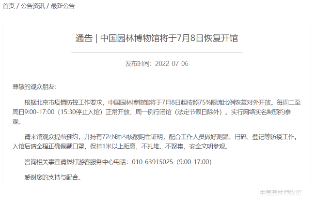中国网旅游7月8日北京电 中国园林博物馆发布最新消息,根据北京市疫情防控工作要求,中国园林博物馆7月8日起按照75%限流比例恢复对外开放。