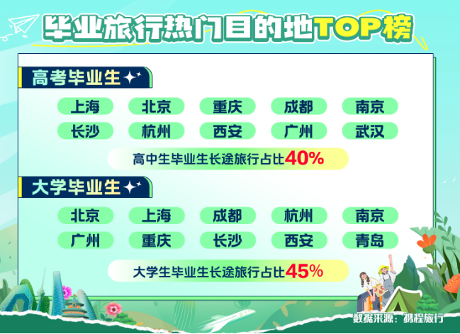 数据显示,高考毕业生预订长途旅游的比例为40%;选择走得更远的大学毕业生更多一些,长途游占比达到45%。
