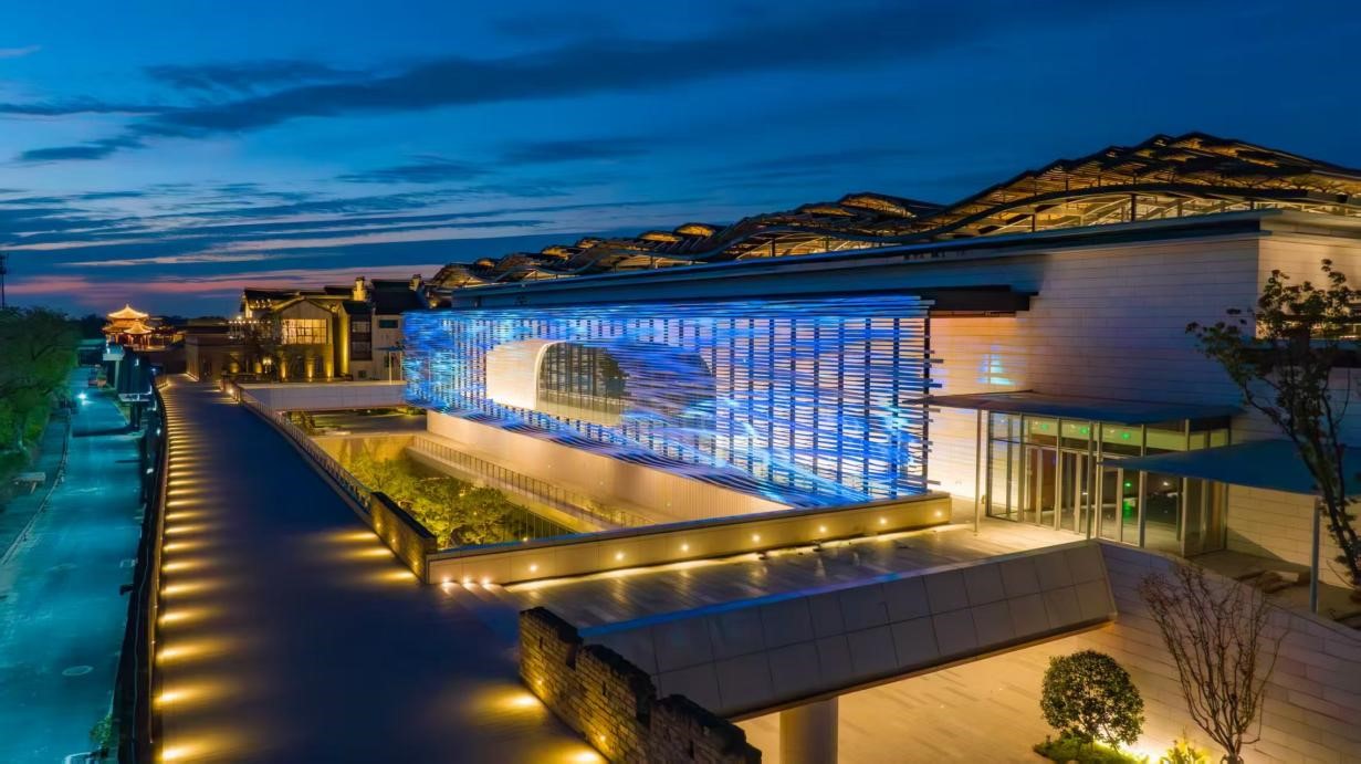 作为全球规模最大的专业特大型室内剧场之一,从空中俯瞰,整个中心宛如一江潮水,奔涌不止,将“潮”的意象直观地展现出来。其外观设计从奔涌不息的钱塘潮中汲取灵感,运用参数化设计手法以及精细化的节点设计,力求打造出一座极富雕塑感与艺术感染力的标志性文化建筑。
