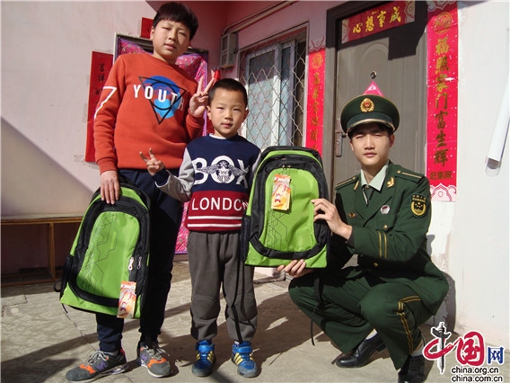 图为全国少年拳击锦标赛57kg第三名获得者闻翌博,在北京市昌平区半截塔村向农村儿童赠送书包。(胡宇摄)