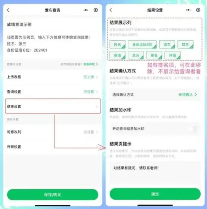 结果设置需要关注的有一点:定制查询结果。如成绩表格中本身就有排名信息,可以通过结果设置将该列移除。九年义务教育阶段是不允许公开学生的成绩和排名的,高中阶段就没有这种限制,如需去掉排名项,将对应的勾选去掉就行了。