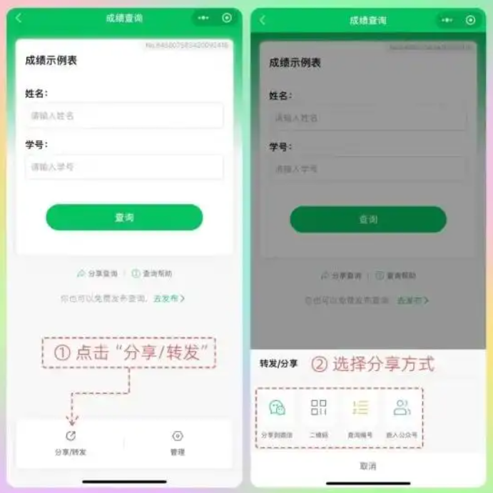 点击【保存/转发】按钮即可发布成绩,成功后会自动跳转到成绩查询的界面,在界面下方找到分享按钮,即可通过多种方式将成绩分享给家长查看。