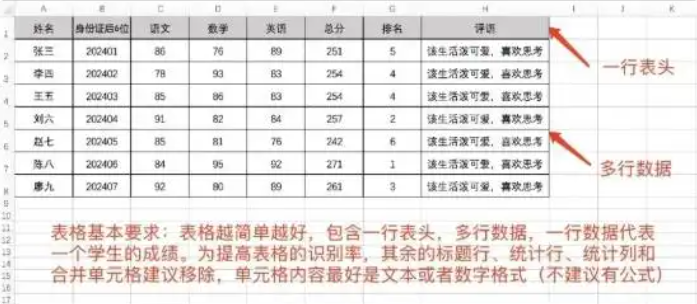 成绩表格没有固定的格式,但需要遵循一定的规范。过度复杂的表格会给小程序带来非预期的解析效果,所以将成绩表格整理成下面这样的表格就OK了。