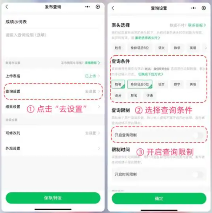 查询限制主要是限制同一个微信能查询到的记录条数,建议开启并设置为1条,避免家长互查成绩。