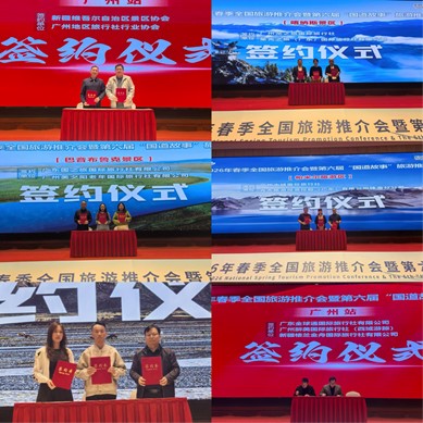推介会现场,新疆维吾尔自治区景区协会、喀纳斯景区、巴音布鲁克景区、帕米尔景区、阿合奇县驯鹰文化旅游景区和新疆楼兰金舟旅行社与当地旅行社签约,推出更多优质新疆旅游线路。新疆维吾尔自治区景区协会和广州地区旅游行业协会的签约为两地旅游企业建立长期稳定的合作机制,引导企业共抓机遇,加大同行业间旅游合作。